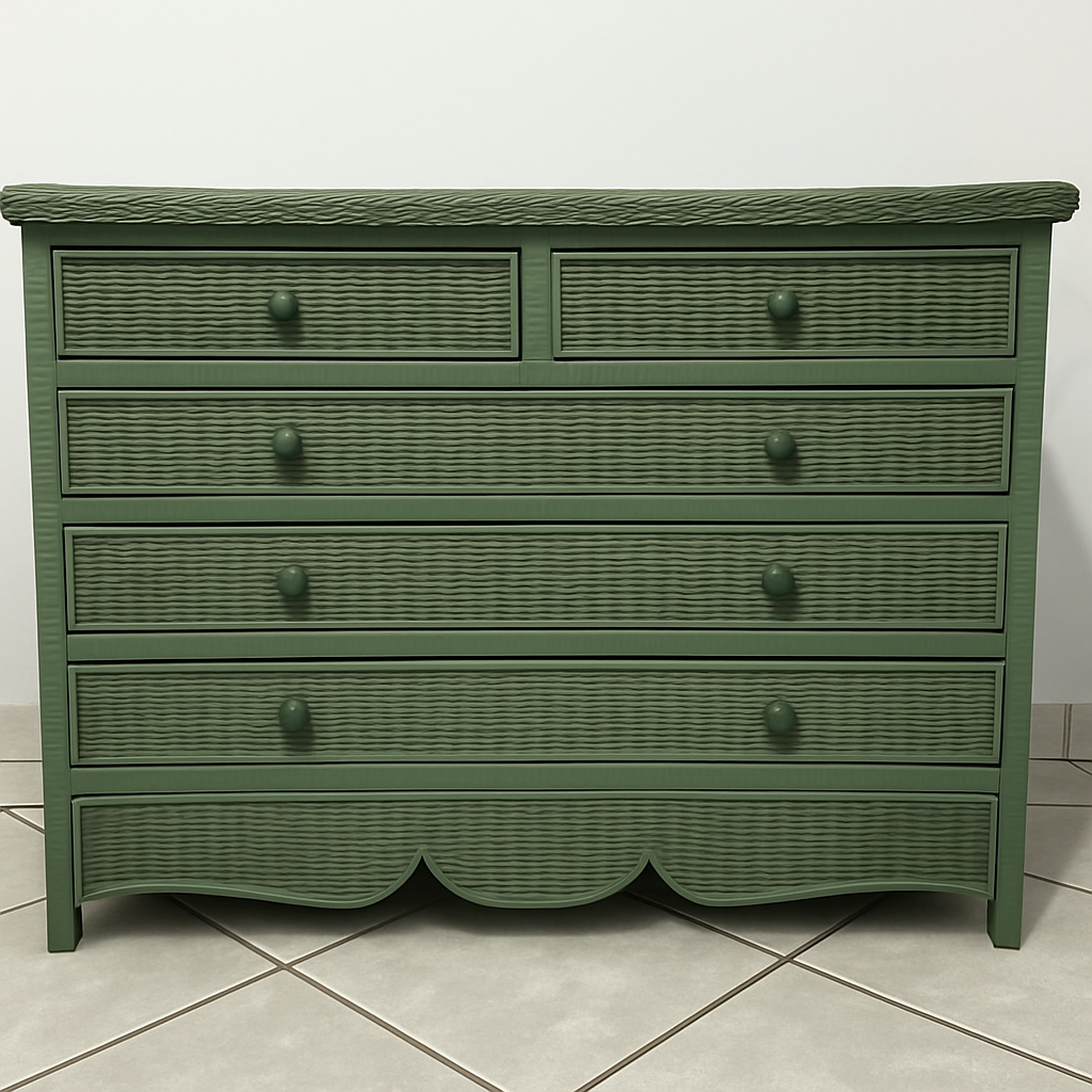 Maravilhosa cômoda de junco natural, ideal para guardar roupas de bebê e muito mais