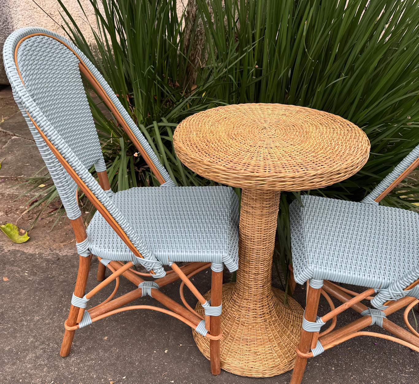 Linda mesa redonda em junco natural. Base em alumínio revestido em junco. Super resistente. Anos de durabilidade
